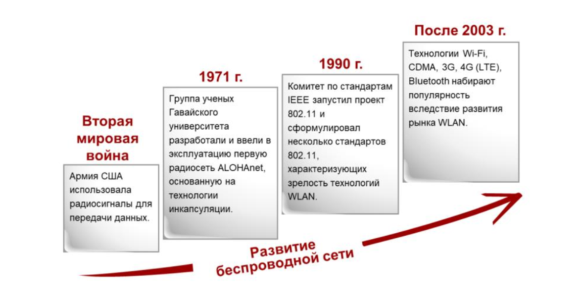 Беспроводная сеть появилась во время Второй мировой войны, когда армия США использовала радиосигналы для передачи данных. Был разработан набор технологий радиопередачи и шифрования, которые широко использовались армиями США и союзников. 50 лет спустя их изобретения изменили жизнь людей.