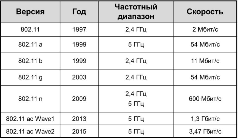 несколько стандартов, таких как 802.11a, 802.11b, 802.11g, 802.11e, 802.11f,