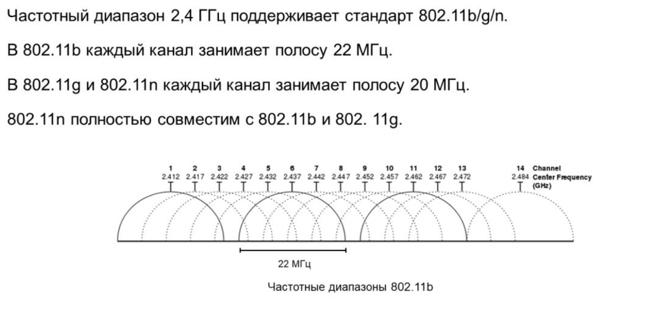 2,4 ГГц. Из них канал 14 может использоваться только в 802.11b. На рисунке