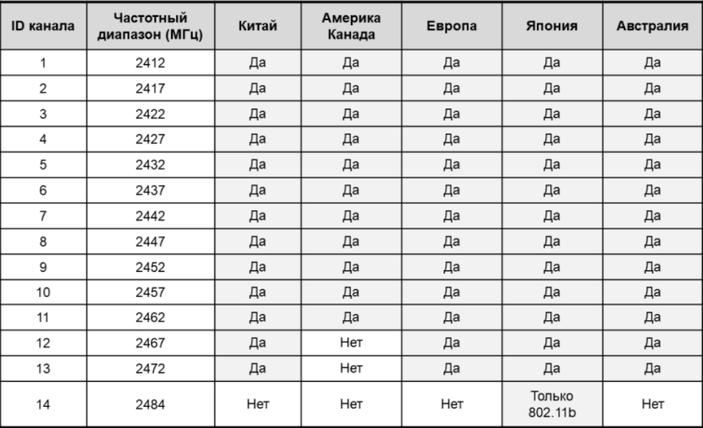 В Японии каналы с 1 по 14 могут использоваться для беспроводной локальной сети