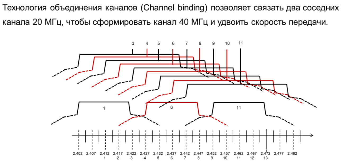 Технология 802.11n позволяет связать два соседних канала 20 МГц, чтобы