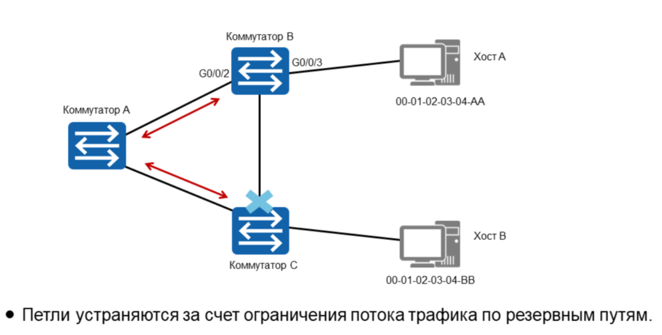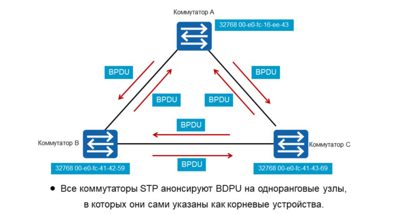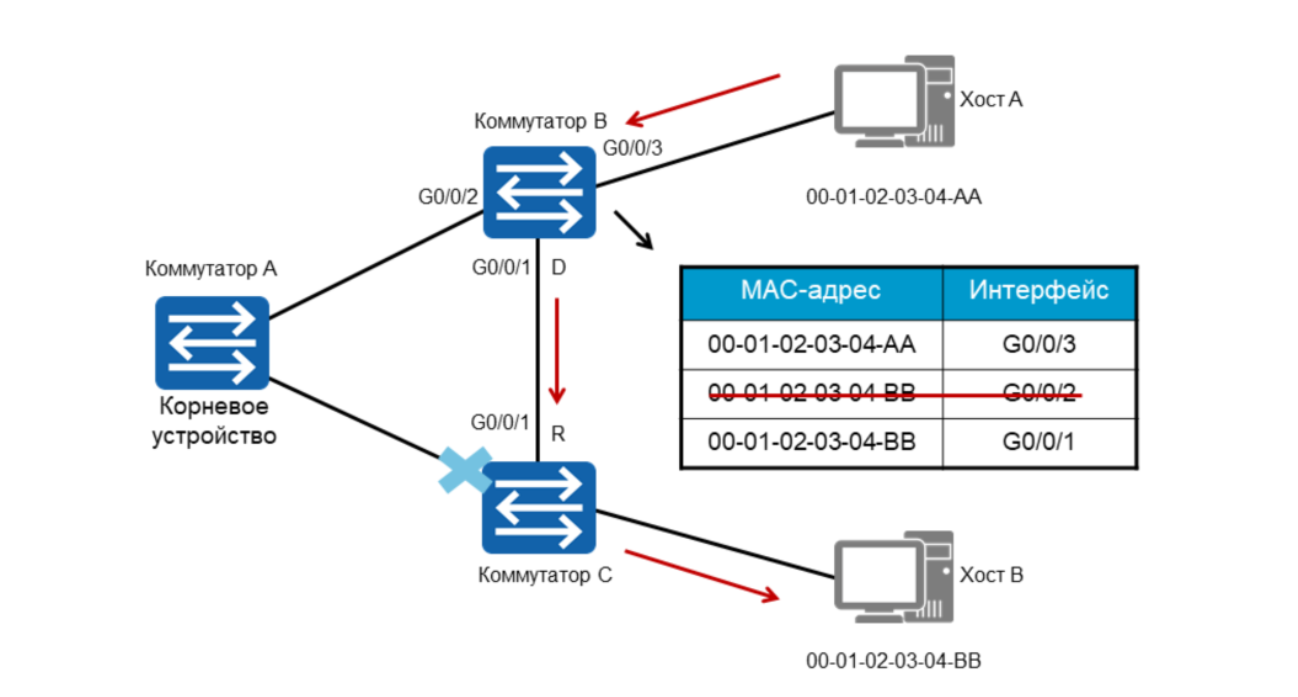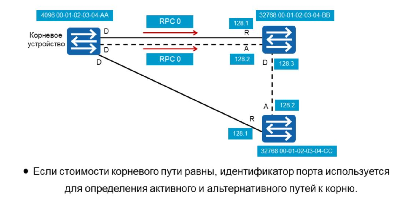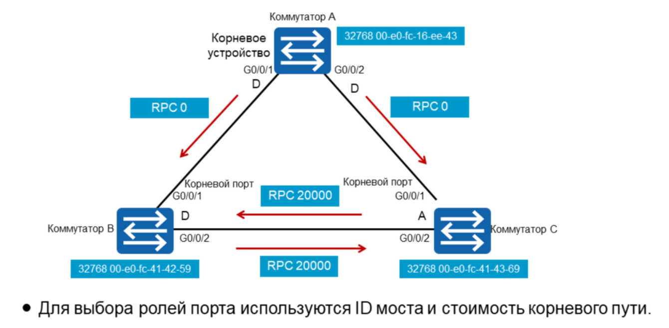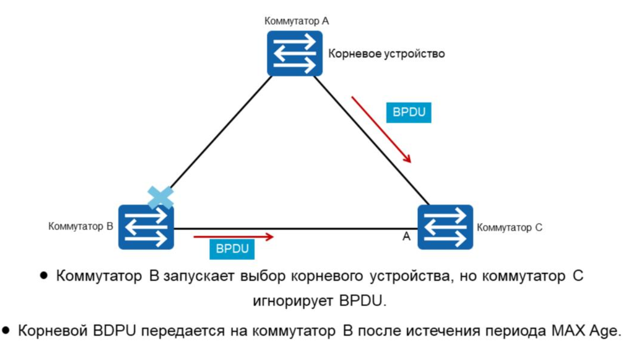 пересылке BPDU от корневого устройства к коммутатору B. В результате