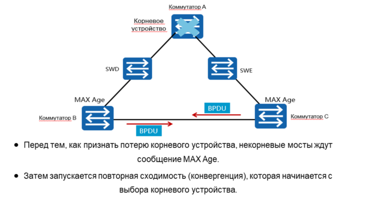 BPDU, обнаруживает потерю соединения на своем корневом порту,