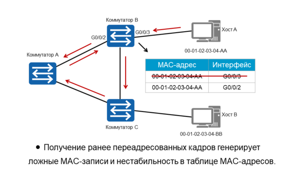 же MAC-адресом источника, что и у хоста А, однако на этот раз прием