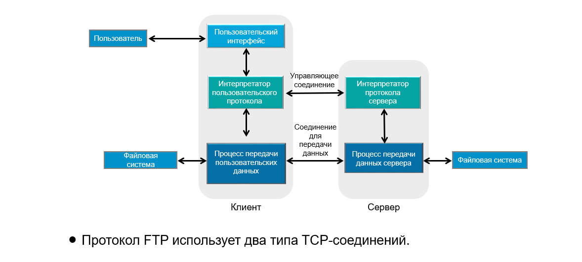 FTP использует два типа TCP-соединений. Одно из них называется управляющим