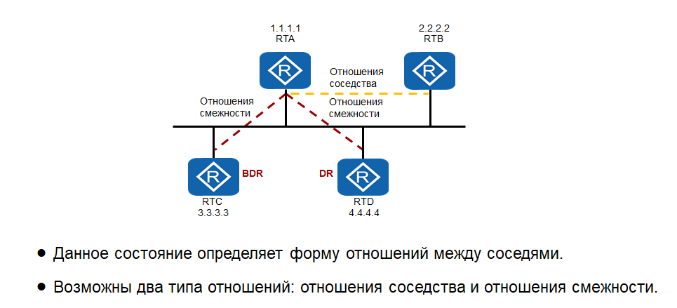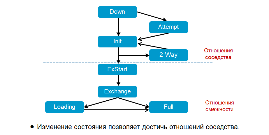 - Отношения соседства (adjacency) — взаимосвязь между соседними маршрутизаторами, установленная с целью синхронизации информации