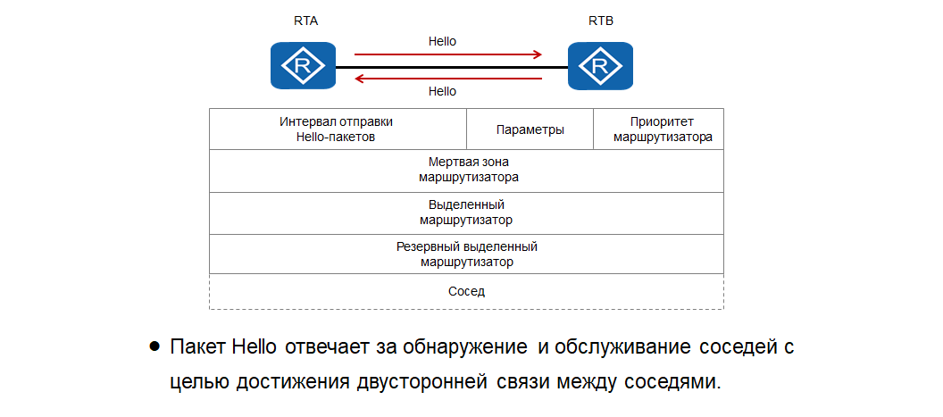 - Hello — пакеты, которые используются для обнаружения соседей, установки отношений соседства и мониторинга их доступности (keepalive)