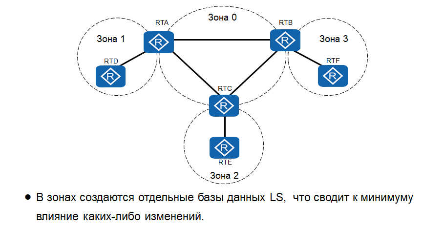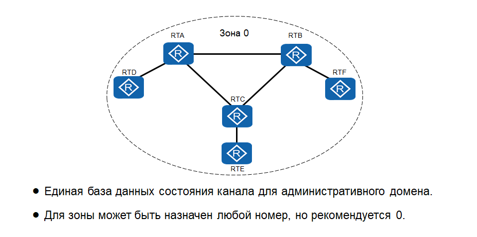 - Зона (area) — совокупность сетей и маршрутизаторов, имеющих один и тот же идентификатор зоны