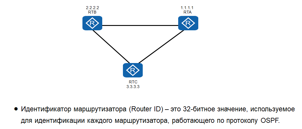 - Идентификатор маршрутизатора (router ID, RID) — уникальное 32-битовое число, которое уникально идентифицирует маршрутизатор в пределах одной автономной системы