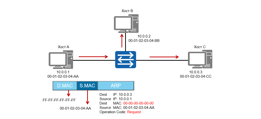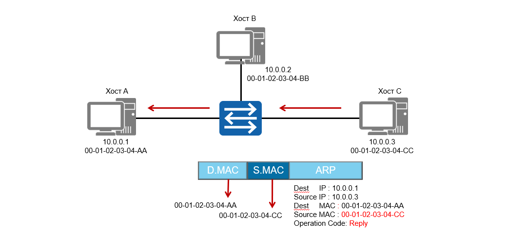 пункта назначения генерирует ответ ARP на исходный источник (Хост A), используя физический